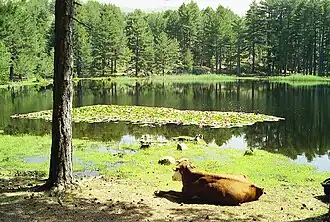 The Lac de Creno is in the Monte Rotondo massif at an altitude of 1,310 metres (4,300 ft).[1] It is in the Orto commune of Corse-du-Sud to the north of the 1,511 metres (4,957 ft) Monte Sant Eliseo. It is drained by the Ruisseau de Creno, which flows south to join the Fiume Grosso, a tributary of the Liamone river.[2] It is a glacial lake, partially covered by water lilies and surrounded by a forest of laricio pines. It is fairly easy to reach by foot from the village of Soccia at an elevation of 1,000 metres (3,300 ft), and is busy in summer.[1]