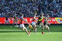 Neale kicks from the centre square in an April 2025 match against Richmond
