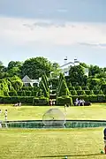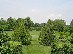 The grounds contain 15 garden rooms, each devoted to a single color, plant or theme, arranged around two cross axes with vistas. The axes meet in an oval swimming pool. The garden is particularly noted for its topiary, which was strongly influenced by Ladew's extensive travel in England, where he frequently went fox hunting. Ladew designed topiaries depicting a fox hunt with horses, riders, dogs, and foxes clearing a hedge, a Chinese junk with sails, swans, and a giraffe, among others.[2] It was proclaimed an "exquisite garden estate" by The New York Times.[2] The Garden Club of America has described it as "the most outstanding topiary garden in America." The grounds also contain a 1.5-mile (2.4 km) nature walk.