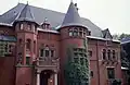 The house is considered to be an example of Queen Anne Revival-style architecture,[1] with some features resembling Richardsonian Romanesque.[6] The garden surrounding the house was designed by landscape architects Olmsted & Eliot.[7] In 1914, a large addition was made to the west of the central tower, again completed by the Maxwell brothers. The property also included a coach house, to the south of the main house, but in the same style and colour. Originally, the grounds included three levels of terraces, rosebeds, perennials, climbing vines and a kitchen garden, which have all now been replaced by a car park, as was the wrought iron gate in the style of Georgian Dublin. The two open-air verandas at the rear of the house, that gave uninterrupted views down over Montreal, the St. Lawrence River and onto the Green Mountains of Vermont, were filled in with windows sometime after 1941. In 1987, the house was described by Francois Remillard in his book Mansions of the Golden Square Mile, Montreal 1850-1930: