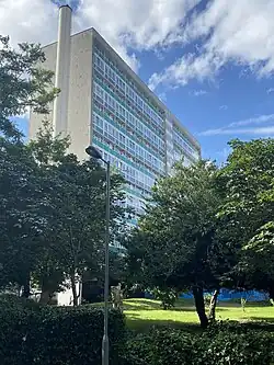 Lakanal House (named after the French politician and educational pioneer Joseph Lakanal) is a 14-storey tower block that forms part of the Sceaux Gardens Estate, Camberwell.[1] It contains 98 flats,[2] and is 137 feet 6 inches (41.91 m) high.[3] The building dates from 1959.[4] It is made up of two-bedroom maisonettes of a two-storey interlocking design. The flats are entered from the right or left side of a central access corridor. On the access level, there are two bedrooms and a bathroom. There are stairs to the upper level where a lounge and kitchen stretch across the full width of the block. This means that the lounge for each flat is above one of the bedrooms of that flat and one of the bedrooms of the flat on the opposite side of the access corridor.[3] The flats were built with fire exits from the lounge and the kitchen to 'exit balconies' on either side of the building, and also a fire exit from the largest bedroom into the central access corridor, separate from the front door.