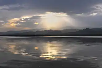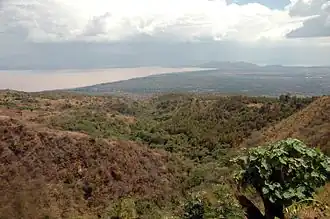Lake Abaya is 60 kilometers long and 20 wide,[2] with a surface area of 1162 square kilometers.[3] There are a number of islands in this lake, the largest being Aruro;[4] others include Gidicho, Welege, Galmaka, and Alkali. The lake is reddish-brown due to a high load of suspended sediments.[5]