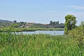 Lake Antiniotissa or Antinioti (Greek: Λίμνη Αντινιώτισσα/Αντινιώτη), sometimes known as Antinioti Lagoon, is a small brackish lake on the north-east coast of Corfu, Greece near Agios Spyridon beach. It is an important wetland area[1] and lies within a Natura 2000 nature protection area[2] of 188 hectares (460 acres)[3] at the western edge of the municipal unit of Thinali. The lake's Greek name translates into English as "the enemy of youth". It was once a malarial swamp and home to the anopheles mosquito,[4] resulting in the area being uninhabited for many centuries, and it is still comparatively undeveloped. The vegetation surrounding the lake includes thickets of reed and bamboo. Inland there are orchards, olive groves and farmland, while between the lake and the sea lie sand dunes. The lake is jointly owned by the twelve principal villages of north-eastern Corfu and leased for fish farming, producing flathead grey mullet, sea bass and eel. It is also used for duck hunting.[5] The adjacent dunes are home to the sand lily (pancratium maritimum) and the agile frog (rana dalmatina).[6] The lake as it was in the 1930s was described by the British naturalist Gerald Durrell in his childhood autobiography My Family and Other Animals, in which it was called the "Lake of Lillies".[7] Durrell wrote that:[8]