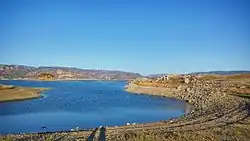 Near the dam on the southeast side of the reservoir is an open bell-mouth spillway, 72 feet (22 m) in diameter, which is known as the Glory Hole.[3] The pipe has a straight drop of 200 feet (61 m),[4] and the diameter shrinks down to about 28 feet (8.5 m). The spillway has a maximum capacity of 48,000 cfs (1360 m3/s). The spillway operates when there is excess water in the reservoir; in 2017 after heavy rains it started flowing, for the first time since 2006.[5] It started flowing again in 2019 after heavy rains. In 1997 a woman was killed after being pulled inside the spillway.[4]