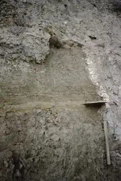 In his monograph on Lake Bonneville, G.K. Gilbert called the offshore deposits of Lake Bonneville the "White Marl".[1] Although the name "White Marl" has not been used by the geologic community in a formal sense, the informal term "white marl" (or "Bonneville marl") is frequently employed.[27] The Bonneville marl at locations far from sources of clastic sediment (gravel, sand, and silt), such as river deltas or active wave zones, is dominated by clay-sized particles of calcium carbonate that precipitated chemically from the lake water.[27] Most of this calcium carbonate is in the form of the mineral calcite, but aragonite is common in Bonneville marl in the Sevier basin and in the lower part of the Bonneville marl stratigraphic section in the main body.[28] Aragonite is the dominant carbonate mineral in sediments of post-Bonneville Great Salt Lake.[29][30] Dropstones, probably mostly derived from shore ice, but possibly also from floating root balls, are common in the marl, and consist of granule- to boulder-sized clasts.[27]