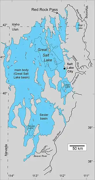 ![]() Map of Lake Bonneville, showing the outline of the Bonneville shoreline, the highest level of the lake. | |