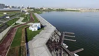 The ecological situation of the lake is in a bad state. It is polluted with waste from surrounding businesses. According to the Ministry of Ecology, about 18 thousand m3 of industrial and communal waste is disposed to the lake. One of the main sources of pollution is the oil waste waters from oil exploration and production boom of the 1930s. The first oil storage reservoir was built near the lake in 1866.[5] In 2004, the ecological state of the lake was placed in extremely poor category.[4] Additionally, the construction works which started with drying out of the lake caused more pollution for the residents of the area. The strong winds of Baku create dust from the sand transported to the lake location to dry the lake.[6] Experts have also alleged that while dehydrating the lake, sediments spread by the wind will cause more ecological problems.[7]