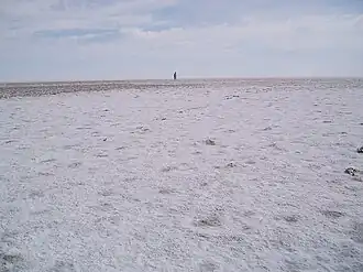 Kati Thanda–Lake Eyre is in the deserts of central Australia, in northern South Australia.[7] It is located around 700 km (430 mi) north of Adelaide, and 400 km (250 mi) from the nearest point of the South Australian coastline.[1] Marree is located at the northern end of the The Outback Highway at the junction of the Oodnadatta and Birdsville Tracks. William Creek, the closest town to the lake, is 200 km (120 mi) away along the unsealed Oodnadatta Track, and still over 60 km (37 mi) from the edge of the lake. Halligan Bay is one of only a few public lookouts.[1] The lake covers over 9,000 km2 (3,500 sq mi).[1]