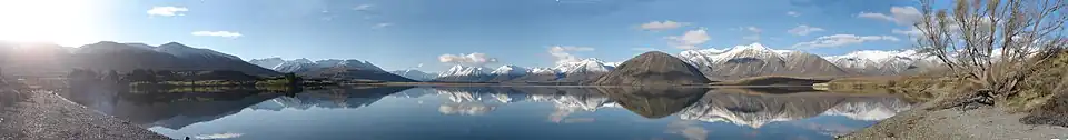 The surface elevation of the lake is 691 m (2,267 ft)[3] and it has a surface area of 695 ha (1,720 acres).[7] It is 40.5 km (25.2 mi) by road northwest of the small settlement of Mount Somers and is located in the upper catchment area of the Rakaia River.[2] The land surrounding the lake is mostly marshland and low hills, but Mt Sugarloaf (altitude 1,238 m (4,062 ft)) rises steeply from the north-eastern shoreline.[4][8] Mt Sugarloaf is an example of a roche moutonnée, a formation that has been shaped by the passing of a glacier.[9] It is listed by the Ashburton District Council in their District Plan 2022 as an Area of Significant Nature Conservation Value.[10]