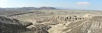 Originally, the Mojave River flowed southward before tectonic changes forced its course into the Mojave Desert between 2 and 1.5 million years ago.[16] At that point, the river ended at Victorville, and after 575,000–475,000 years ago, in Harper Lake.[75] About 500,000 years ago, it reached the Cady Basin of Lake Manix, based on tephrochronological dating of the Bishop Tuff. At first, the river may have alternated between Harper Lake and Lake Manix. 190,000 years ago, Afton Basin was integrated with the other three basins, as the river cut through the Buwalda Ridge.[5] The presence of deposits with chaotically bedded rocks suggests that the breakthrough took the form of a catastrophic flood[41] that may have been a mudflow.[76] Afton Basin had a bottom at an altitude of c. 460 metres (1,510 ft) before; as it was integrated into Lake Manix, sedimentation progressively filled it.[77] The course change from Harper Lake to Lake Manix was not immediately stable; 25,000 years ago, the Mojave River was again filling both lakes before definitively shifting to Manix by 20,000 years before present.[11]