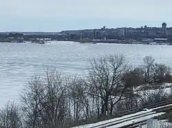 Hamilton Harbour frozen over. Ice sheets can form along the shoreline of Lake Ontario during the winter.