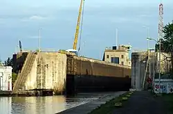 Canal Lock 1 at the Welland Canal in Lake Ontario. The canal forms a part of the Great Lakes Waterway, which connects Lake Ontario with the St. Lawrence River and other Great Lakes.