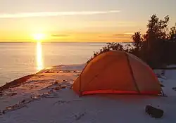 Agawa Bay is also the location of the park's visitor centre where information can be obtained about the park and surrounding areas. There are washrooms and a gift shop open to the public from May through September. The visitor centre has a display area orchestrating the history of the park and the influence that Lake Superior Park had on the fur trade, the Group of Seven artists and shipwrecks in the region. There are trailer storage opportunities available, but arrangements must be made with senior staff located in the northern part of the park at the park office. The visitor centre has received a number of awards for its design.[13][14]