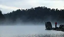 Lake Waikaremoana is located in Te Urewera in the North Island of New Zealand, 60 kilometres (37 mi) northwest of Wairoa and 80 kilometres (50 mi) west-southwest of Gisborne. It covers an area of 54 square kilometres (21 sq mi). From the Māori Waikaremoana translates as 'sea of rippling waters'.[1]