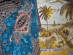 A printed cotton lamba typically featuring a proverb on the lower border of the design, identical to the kangas worn throughout eastern Africa. The lambahoany is presently the most commonly worn type of lamba. These are traditionally made of printed cotton featuring a repeated border design that encloses either a secondary pattern (often around a central medallion) or a large image depicting a pastoral scene from daily life. A popular proverb, or ohabolana, is typically written just above the center of the lower border. The uses of the ubiquitous lambahoany are numerous and varied. They are often wrapped to attach an infant to its mother's back, freeing her hands for other uses. They may also serve as light blankets, sheets, an apron, a transport sack, a tablecloth or a sunshade, and when tightly coiled they can be used as a cushion when carrying heavy objects on top of the head.[3]