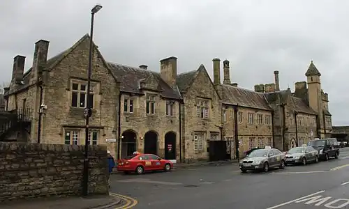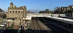 The main building, constructed in 1846 by William Tite, was situated on the west side of the line in Tudor Revival style using roughly squared sandstone rubble. This two-storey building was extended southwards in 1852 in similar style, although this section terminated in a tower of three storeys. A new entrance was constructed in 1900 on the eastern side of the line at footbridge level; this is nearer the town and houses the remaining ticket office.[3]