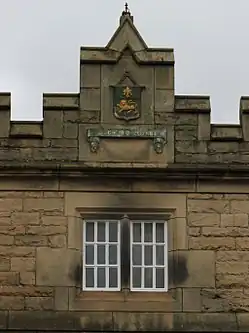 The 1852 extension includes a relief carving of the coat of arms of Lancaster