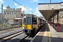 The station was remodelled in 1900-1906 when additional lines and platforms were added and further station buildings constructed.[3] The new buildings were styled mock-Elizabethan with the intention of mirroring the battlements of the nearby Lancaster Castle. Platforms 5 and 6 (on the east side of the station) were electrified in 1908 to serve the now-closed "Little" North Western Railway route to Morecambe and Heysham. This line closed in January 1966 and the overhead line equipment was removed.