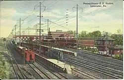 The legislature revised its plan to include the failed attempt with a connection from the canal terminus in Columbia to Philadelphia. Engineers recommended that a rail route—the Philadelphia and Columbia Railroad—be constructed with an inclined plane at either end.[18] The original route of the railroad was to pass north of Lancaster, but the city petitioned the state to alter it so that the railroad passed through downtown Lancaster.[19] The Philadelphia and Columbia Railroad opened in 1834, originally with a horse-drawn passenger cars before steam locomotives replaced them as motive power.[20] There are no photographs of the early Lancaster station, however the station would have most likely consisted of nothing more than an open-air, elevated platform, as was customary for train stations of that period.[21] The station was located at North Queen and East Chestnut Street, with the platform possibly extending the length of the lot between Queen and Christian Streets.[21]