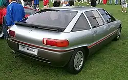 The Medusa was designed by Italian designer Giorgetto Giugiaro in 1979. Giugiaro designed the car to be as aerodynamic as possible, aiming for a target of 0.25 Cd, with the final design achieving a Cd of 0.263. The original the clay model reportedly had achieved a lower reading of 0.255 Cd, but the addition of side mirrors, indicator repeaters and a radiator caused it to go up.[2] The Medusa featured many design elements that were tailored to help it achieve better aerodynamics. Features such as pop up headlights, door handles and window glazing that sit flush with the body, inset turn signal repeaters and doors that wrapped up into the roof all helped the Medusa to be as aerodynamic as possible.[2]