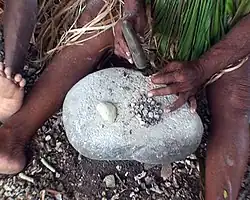 Four different types of shell are used in making shell money, A red lipped rock oyster known as "romu" (Chama pacifica in the family Chamidae), white shell known as "ke'e" (Beguina semiorbiculata in the Carditidae), black horse mussel shells called "kurila" (Atrina vexillum in the Pinnidae) and thick white disks from a rigid cockle known as "kakadu" or "kakandu" (Anadara granosa in the Arcidae)[15][16]