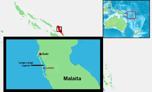 Langa Langa Lagoon or Akwalaafu is a natural lagoon on the West coast of Malaita near the provincial capital Auki within Solomon Islands. The lagoon is 21 km in length and just under 1 km wide. The "lagoon people" or "salt water people" live on small artificial islands built up on sand bars over time where they were forced to flee from the headhunters of mainland Malaita.