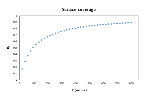An example plot of the surface coverage θA = P/(P + P0) with respect to the partial pressure of the adsorbate. P0 = 100 mTorr. The graph shows levelling off of the surface coverage at pressures higher than P0.