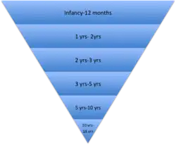 - Children aged 2–3 communicate best in a turn-taking style. This creates a conversational structure that makes it easier for verbal communication to develop. It also teaches patience, kindness, and respect as they learn from the direction of elders that one person should speak at a time. This creates interactional synchrony during their preverbal routines that shapes their interpersonal communication skills early on in their development.[39] Children during this stage in their life also go through a recognition and continuity phase. Children start to see that shared awareness is a factor in communication along with their development of symbolic direction of language. This especially affects the relationship between the child and the caregiver; it is a crucial part of self-discovery for the child when they begin to take ownership over their own actions in a continuous manner.[39]