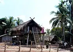 Lao Loum houses are built on wooden piles with the floor from one to two-and one-half meters above the ground. This style keeps the living area above the mud of the rainy season, provides a shady area under the house to work or rest during the day, and allows the house to catch breezes for natural cooling. Depending on the wealth and resources of the family, the walls and floor may be made of woven split bamboo or sawn wood; the roof is constructed from grass thatch, bamboo, wood shingles, or corrugated steel roofing sheet. Some older houses in well-off villages are roofed with clay tiles, but this style was no longer common in the early 1990s. A separate rice granary is built in the house compound, also on posts using similar construction. Livestock is sometimes kept under the house.[2]