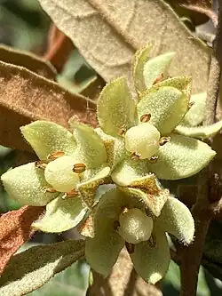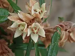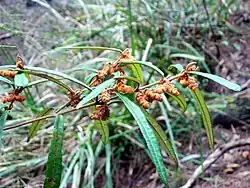 • Lasiopetalum ferrugineum Sm. ex Andrews var. ferrugineum,[10] that has narrow elliptic to lance-shaped leaves mostly less than 10 mm (0.39 in) wide.[11]