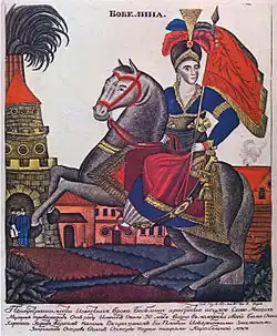 The siege of Nafplion continued until the rebels became aware of the Kehaya Bey's force which had reached Corinth and was heading to relieve the siege. Yiannis Yiannouzas then assembled troops from Argos, Spetses and Kranidi in order to check the Kehaya Bey's advance and was killed in May in the ensuing battle outside Argos. Bouboulina subsequently traveled to the battlefield in order to collect her son's remains who was beheaded in the aftermath of the battle. According to Dutch consul Taitbout de Marigny she personally executed three Ottoman prisoners during her son's funeral ceremony. After failing to capture Argos[15] or burning it (according to Kolokotronis),[16] the Kehaya Bey reinforced Nafplion's garrison and departed for Tripolitsa. Bouboulina then resumed the naval blockade of Nafplion. In May 1821, she blockaded Monemvasia with the Agamemnon, while the rest of the Spetsiot fleet remained off the shore of Nafplion.[15][note 2] The garrison of Monemvasia surrendered on 25 July, at the same time another of her ships[note 3] resupplied Galaxidi.[15] Rumors of Bouboulina's exploits spread beyond Greece and many foreign philhellenes sought to meet her. During one such meeting in Astros, one foreign volunteer (Maurice Persat) showed her a lithograph depicting her which he had purchased in Paris. The highly romanticized and inaccurate depiction caused Bouboulina to burst out laughing.[15]