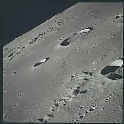Oblique view of vicinity of Lassell from Apollo 12, with Davy in the foreground