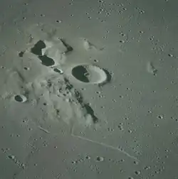 Oblique view of Lassell C (center) and the Lassell Massif (left), from Apollo 16. The irregular depressions in upper left are called Lassel G and K.
