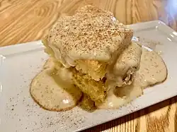 Latiya (Lantiyas in CNMI dialect) is a Chamorro dessert from Guam made from sponge cake, vanilla custard, and cinnamon.[1][2][3] In Saipan and the other Mariana Islands, it is called lantiya.[4] First, the sponge cake is baked, sliced, and then covered with a custard.[4] The sponge cake can be one of any variety, such as pound cake, carrot cake, or Chamorro cake.[2] The custard may or may not contain eggs, and can also be poured in between the layers of cake.[2] At the end, the cake is topped with cinnamon.[4]