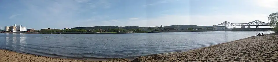 In 1887 a wooden bridge crossing the Mississippi over Latsch Island was created to join Winona to Wisconsin.[9] In 1890 Congress authorised Winona to construct a new bridge over the Mississippi; the result was that in 1892 the Chicago Bridge and Iron Company created the steel and iron "Wagon Bridge" which spanned over the river and the island into Winona's main street.[10] In 1917 the old wooden bridge was replaced by a concrete bridge.[9]