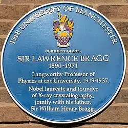 A blue plaque commemorating Bragg's work at the University of Manchester