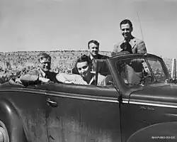 Group portrait of Los Alamos scientists William Penney, Beatrice Langer, Emil Konopinski, and Lawrence Langer in a Ford Deluxe car.