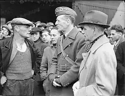 Air Marshal L A Pattinson, Air Officer Commanding-in-Chief Flying Training Command, talking to workers at Rugby, Warwickshire, on the completion of an RAF training station in the Midlands
