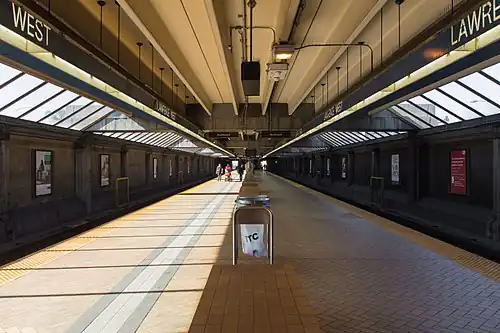 In 2014, an elevator, automatic sliding doors and an accessible fare gate were installed in the main part of the station on the south side of Lawrence Avenue, to make the station wheelchair accessible.[4] In addition, repairs were made to the sawtooth bus platforms and the roadway was repaved for low floor buses.[5] The northside entrance remains inaccessible due to space restrictions and generally used as drop off point by car.