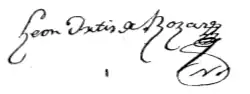 León Ortiz de Rozas married September 30, 1790 in Buenos Aires to Agustina López de Osornio,[10] daughter of Clemente López de Osornio and María Manuela de Rubio, belonging to a distinguished Creole family. He and his wife had twelve children, Juan Manuel, María Dominga, Gregoria, Andrea Mercedes, Prudencio, Gervasio José, María, Juana, Benigno, Manuela, Dominga Mercedes and Martina Agustina.[11]