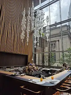 The restaurant also includes a bar and lounge area with seating for 46 guests, with an à la carte menu.[1] The bar has a hand-blown glass chandelier designed by sculptor Andy Paiko.[5] Additionally, the restaurant has a "garden table", for guests to have special food and wine experiences led by guest chefs and winemakers.[5]