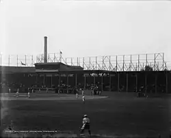 When it originally opened in 1891, it had 9,000 wooden seats.[9] A single deck grandstand was behind homeplate, a covered pavilion was along the first base line, and bleachers were located at various other places in the park. The ballpark was configured to fit into the Cleveland street grid, which contorted the dimensions into a rather odd rectangular shape by modern standards. The fence in left field was 385 feet (117 m), 460 feet (140 m) away in center, and 290 feet (88 m) down the right field foul line.[17] Batters had to hit the ball over a 40-foot (12 m) fence to get a home run (by comparison, the Green Monster at Fenway Park is 37 feet (11 m) high).[18]