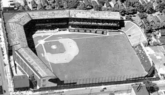 Batters still had to surmount a 40-foot (12 m) fence to hit home runs.[18] The fence in left field was only five feet tall, but batters had to hit the ball 375 feet (114 m) down the line to hit a home run, and it was fully 460 feet (140 m) to the scoreboard in the deepest part of center field. The diamond, situated in the northwest corner of the block, was slightly tilted counterclockwise, making right field not quite as easy a target as Baker Bowl's right field (which had a 60-foot (18 m) wall), for example.