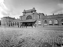A basic design was produced by Dirk Margadant, which was then completed by Theodor Sanders.[5] This station took inspiration from Berlin's Lehrter Bahnhof, with which it shared a triumphal arch central window flanked by double columns in the façade.[6] Margadant would return to this idea in a more stylized form in his later design for the (still extant) railway station in Haarlem (1908).