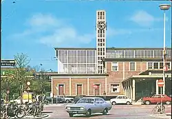 These traffic issues led to the decision to elevate the railway lines, which necessitated reconstructing the station. An entirely new station building was opened in August 1953.[10] This station was designed by Herman Schelling, who had gained some renown as the architect of Amsterdam's Muiderpoort station. Stylistically, it matched his other post-war designs such as those in Enschede and Hengelo. While the end of the traffic problems around the staton was welcomed, Schelling's design itself was not received favorably.[11] Its rather austere style contrasted markedly with the opulent forms of its predecessor and was regarded as unbefitting Leiden's status as the predominant university city in the country.[12] In addition, increasing numbers of passengers soon caused the somewhat undersized building – with public areas not much larger than those of its predecessor – to become overcrowded.