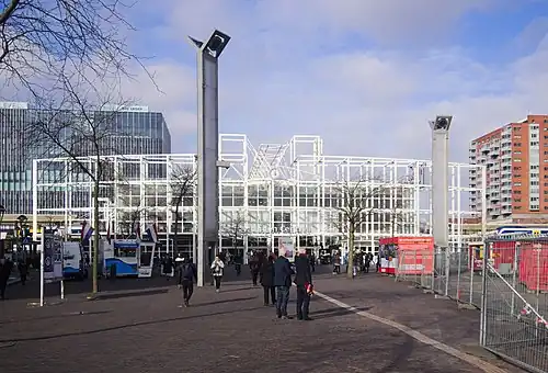 While the new station's design was initially well-regarded, its eclectic style increasingly raised criticism.[7] More problematically, the ground-level crossings of the busy railway line caused increasing traffic and safety problems as the years went by.[8] Moreover, goods facilities were located at the front of the station and further limited space and access. This situation was made worse after the Blauwe Tram ("blue tram") linking Leiden to Scheveningen was connected to the station in 1924. On 11 December 1944, the station area was subjected to a bombing raid by the RAF aimed at nearby V-2 rocket installations. The building station itself was damaged as well, particularly the central arch window.[9] Although the damage was repaired after the war, the window was restored in a much simplified form.