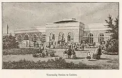 A permanent building could be opened on 15 June 1843. This station was a modest, single-story affair and had been designed by railway engineers Frederik Willem Conrad and Cornelis Outshoorn, who were also responsible for Haarlem's first station.[3] It consisted of a small hall and two wings, which housed offices and services. At the time, the station site was part of the neighboring village of Oegstgeest rather than Leiden itself.