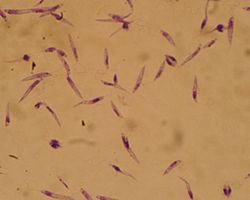 Upon entering the mammalian bloodstream, L. major meets the focal point of infection, the macrophage. As a result of two surface molecules, the protease gp63 and a lipophosphoglycan, promastigotes are able to bind to several macrophage receptors.[13][14] Promastigote attachment to macrophages is facilitated by a number of receptors, including complement receptors CR1 and CR3, and the receptor for advanced glycosylation end products.[5] Activation of complements occurs far from the cell membrane, and insertion of the membrane attack complex does not occur.[5] This action is what allows the parasite to avoid being lysed, and to persist within the host's macrophages. In cattle Th1 and Th2 cells are an important part of the response.[15] Neither cell type expresses exclusively IFNγ or IL-4 for L. major – Brown et al. 1998 find they express both in cattle.[15] The bovine myeloid antimicrobial peptide BMAP-28 has leishmanicidal activity and may be usable in vivo in cattle infection.[16] Lynn et al., 2011 obtain good results against two strains of the parasite, using two isoforms of BMAP-28, the retro-inverso and the D-amino acid.[16]