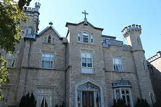 Leland Castle (also known as Castle View) is a building in New Rochelle, New York. It was constructed during the years in 1855 - 1859 in the Gothic Revival style, and was the country residence of Simeon Leland, a wealthy New York City hotel proprietor. Leland began to assemble an estate as early as 1848, and in 1855, began the erection of this palatial 60-room mansion.[3] The home was designed by New York City architect William Thomas Beers. A north and south wing were added to the castle in 1899 and 1902 respectively.[2][4]