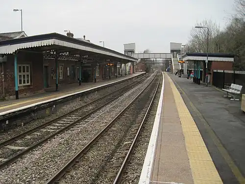 Leominster railway station lies on the Welsh Marches Line, serving the town of Leominster in Herefordshire, England. It is situated 11+14 miles (18.1 km) north of Hereford. The station has two operational platforms, for northbound services via Ludlow and southbound via Hereford; in the past, it had three more for discontinued services to Worcester and Kington.